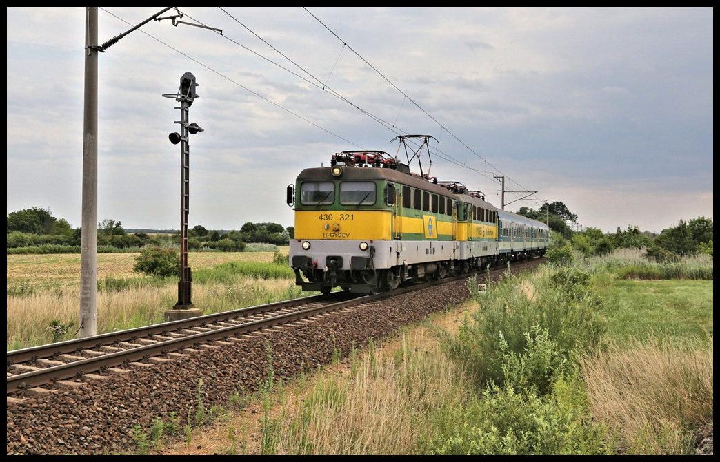 Kurz vor dem Haltepunkt Kemenspalfa ist hier die GYSEV 430321 am 15.7.2022 um 15.56 Uhr mit dem IR nach Celldömölk unterwegs. Am Haken hat sie auch die abgebügelte Schwesterlok 430322. Gerd Hahn