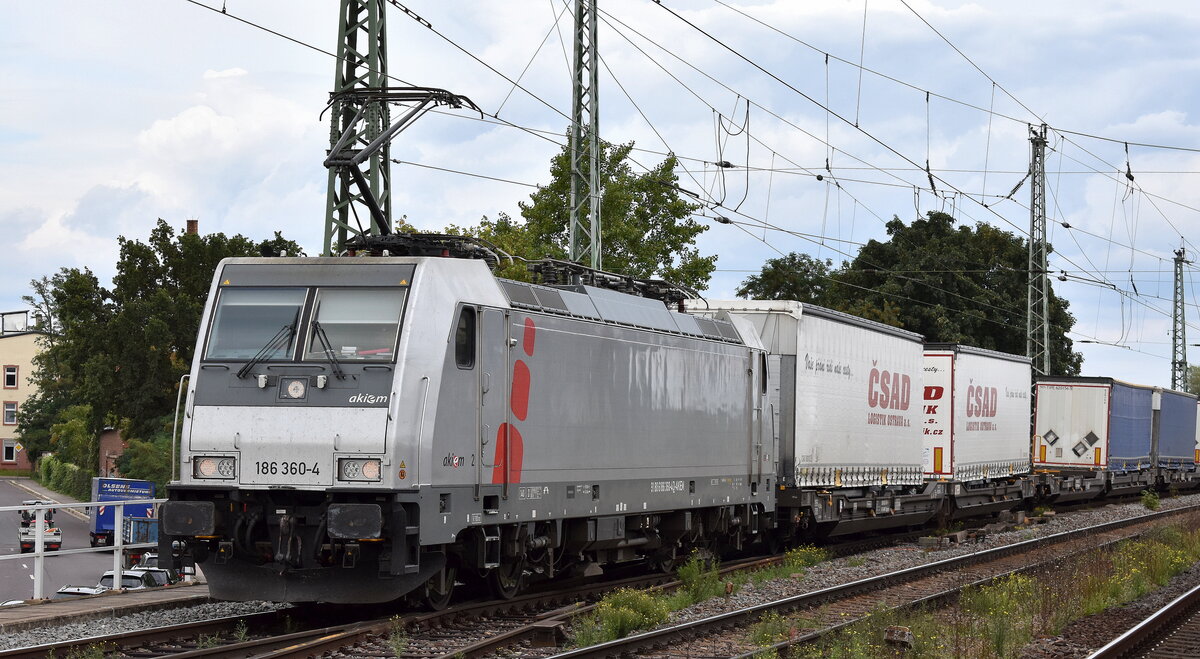 CER Hungary Közép-Európai Vasúti Árufuvarozási, Kereskedelmi és Szolgáltató Zrt., Budapest [H] mit der Akiem Lok "186 360-4"[NVR-Nummer: 91 80 6186 360-4 D-AKIEM) und einem KLV-Zug am 30.08.23 Vorbeifahrt Bahnhof Magdeburg-Neustadt. Lothar Stöckmann