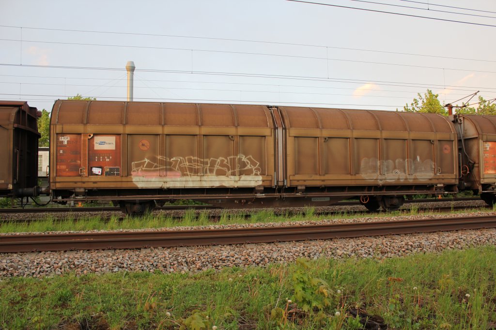 In Ungarn registrierte zweiachsige Schiebewandwagen mit der Bezeichnung "Hbbillns14", abgestellt auf den Anschlussgleisen der KME Mansfeld GmbH und fotografiert vom öffentlich zugänglichen Bahnübergang Schloßstraße in Hettstedt.