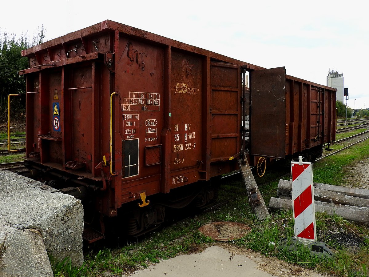 Offener Drehgestell-Hochbordwagen vom Einsteller Rail Cargo Hungaria mit der Nr. 31 RIV 55 H-RCH 5424 810-6 Eas-y in einem Ganzzug am 02.02.24 Höhe Bahnhof Eilenburg. Lothar Stöckmann