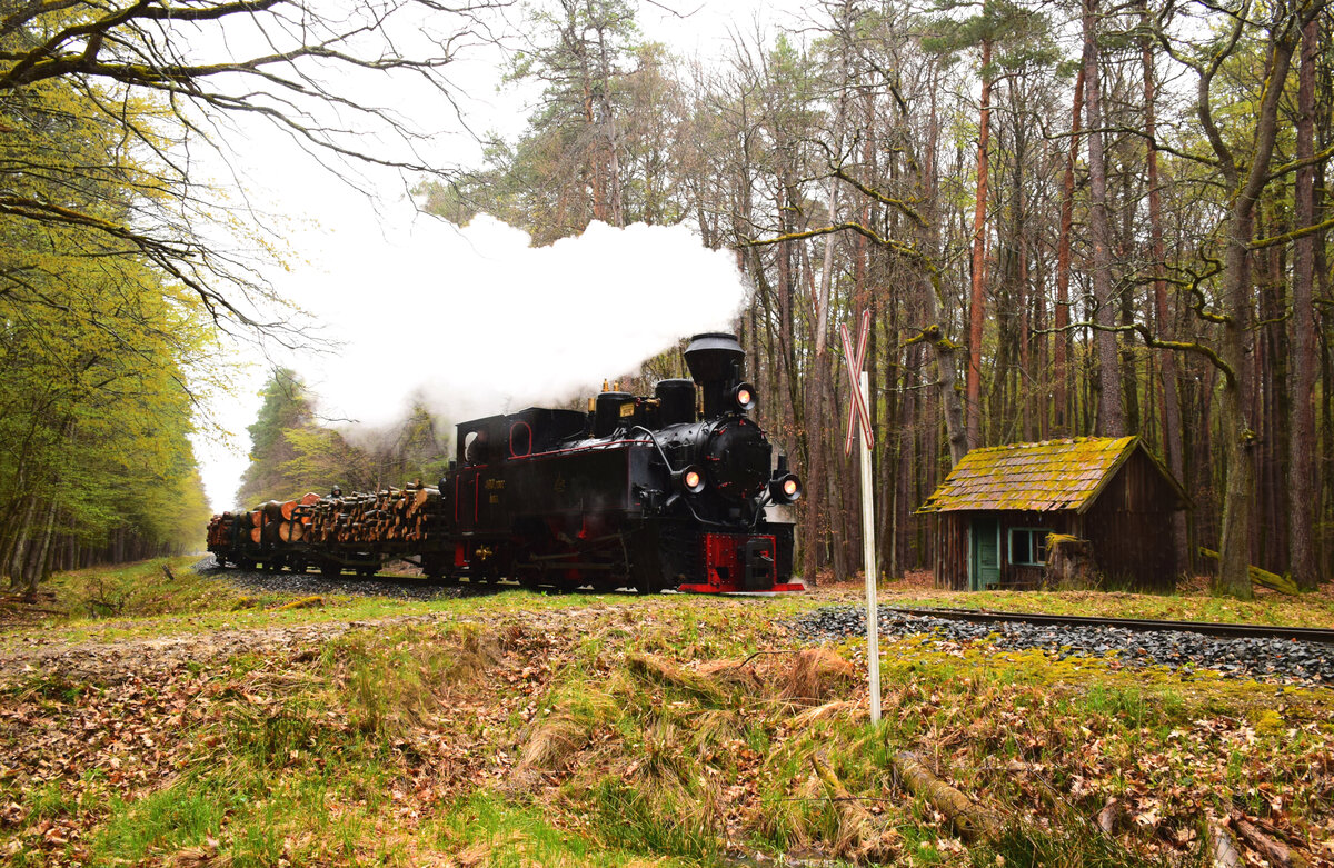 Waldbahn-Idyll in Ungarn: die Dampflok 490.2002  ÁBEL  mit einem Fotogüterzug auf der Csömödér Schmalspurbahn.