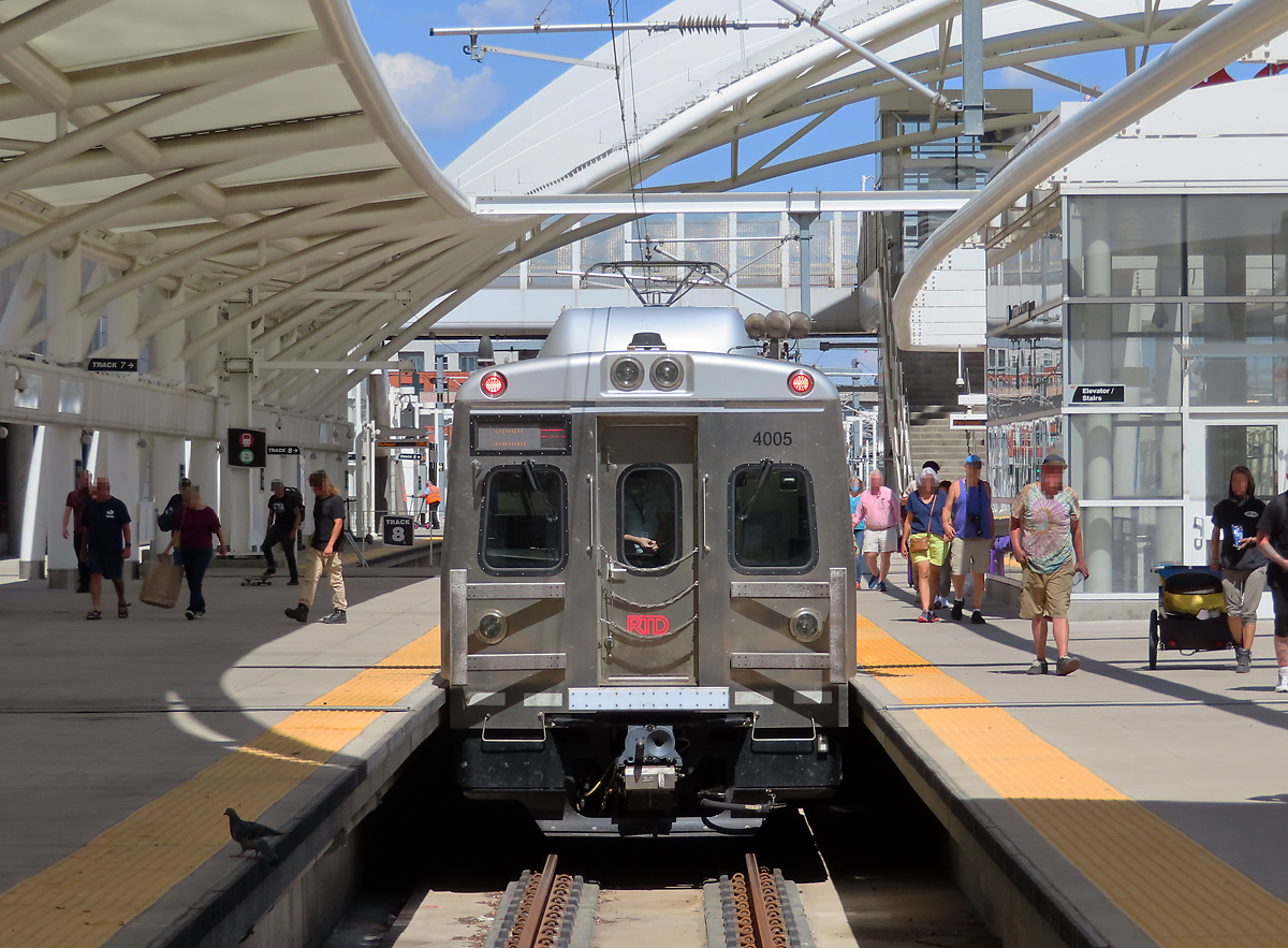 Modernisierter Bahnhof der Denver Union Station am 15.5.2019, kein Vergleich mehr mit dem Bahnhof, den ich 1999 kennengelernt habe. Inzwischen gibt es hier auch ein modernes Stadtbahnnetz, links ist der Airport-Express. Der California Zephyr ist der einzige Fernzug hier.