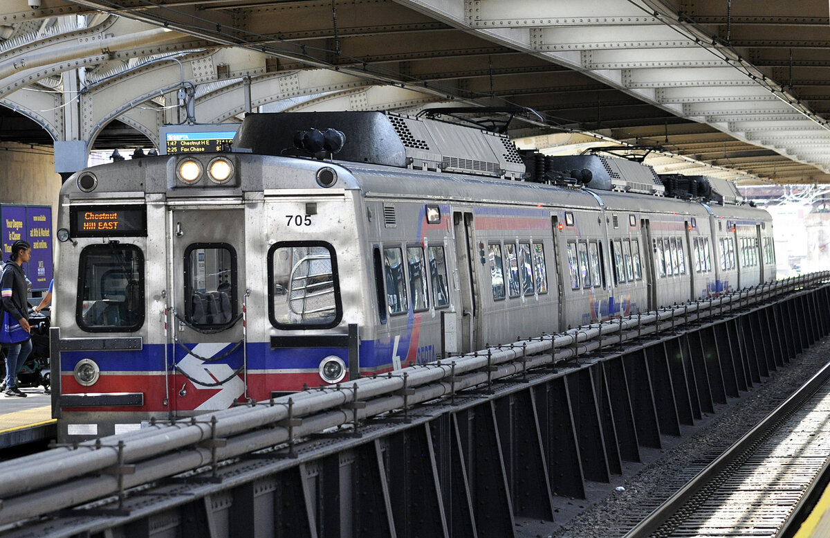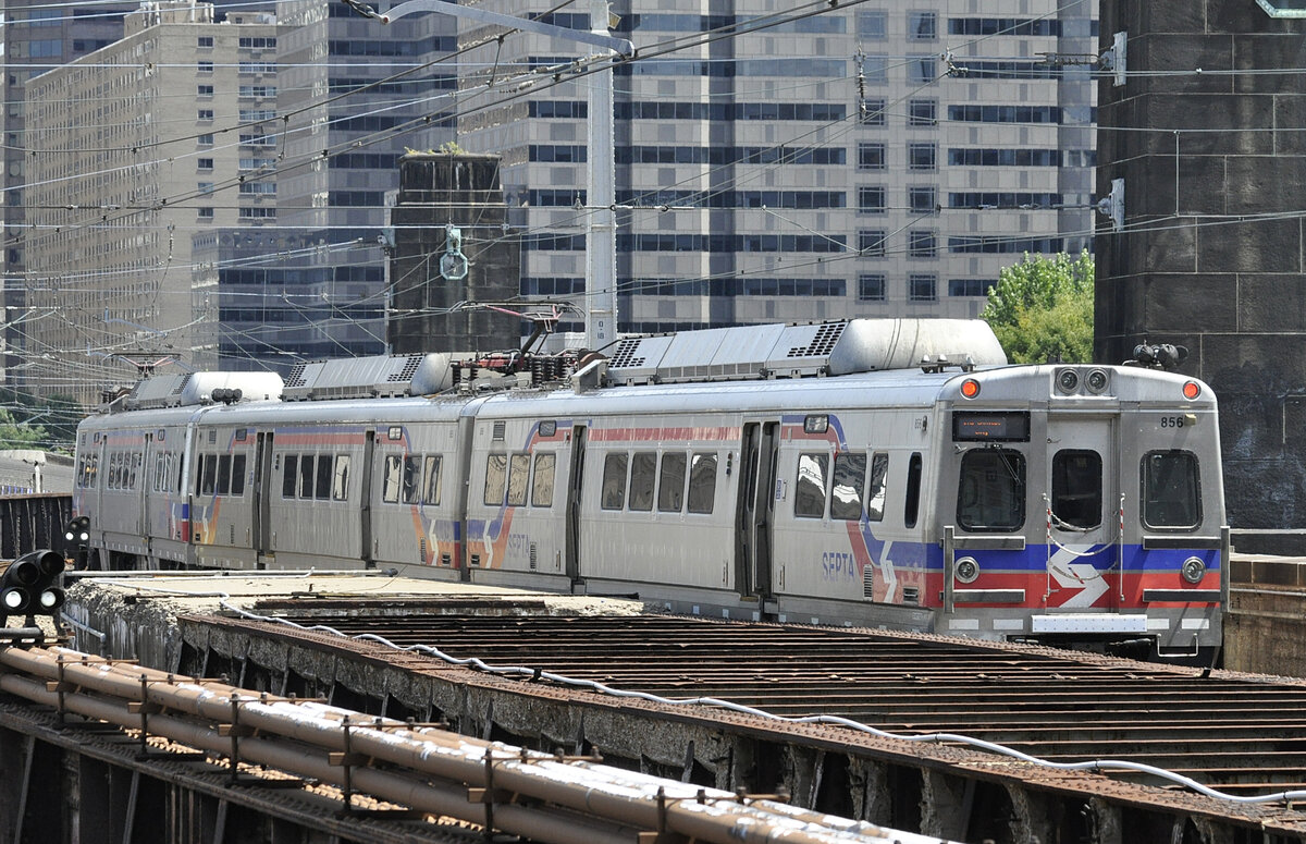 Silverliner V SEPTA 830, Philadelphia 30th Street Station, obere Platform, 22.06.2012. Der vierteilige Zug kommt aus der Innenstadt und überquert gerade den Schuykill River.