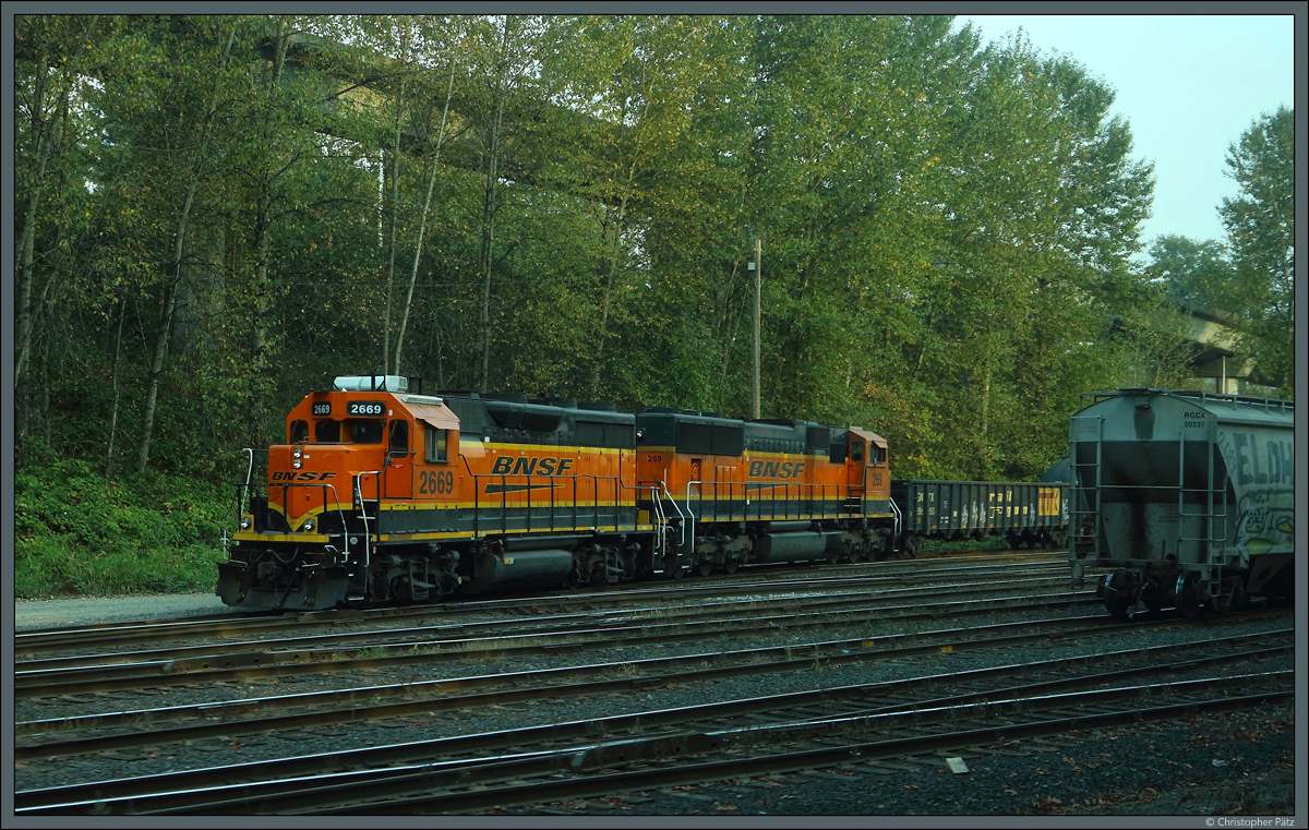 Die Loks 2669 und 269 der BNSF rangieren am 18.10.2022 einen Güterzug bei Vancouver.