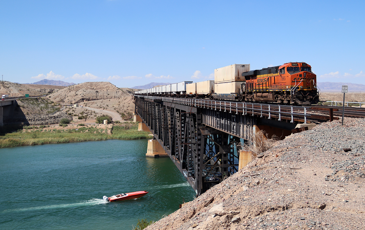 Diese Schlusslok schiebt ihren Zug über die Brücke über den Colorado River an der Grenze Kalifornien/Arizona Richtung Westen. Links ist der Highway zu sehen, diese Fotostelle ist also sehr leicht zu erreichen. Topock, AZ, 30.9.2022