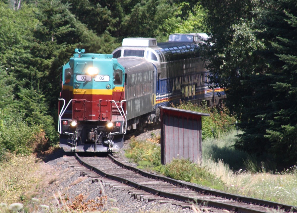 13.7.2012 Parkdale, OR. #0202 der Mt. Hood Railroad bei der Einfahrt - im Hintergrund Mt. Rainier, WA. Die beiden Domcars stammen von der Holland - America - Line (zumindest war ein derartiger Schriftzug erkennbar) und stammen aus den 60ern. Die kleine Bahngesellschaft betreibt auch Güterverkehr.