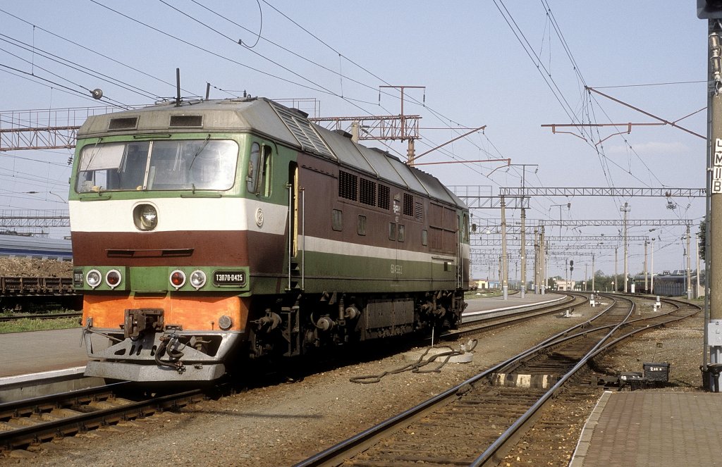 TEP70-0212 im Bahnhof von Gomel am 5.9.16. Eine schwarze Dieselwolke beim starten des Motors vernebelt die Sicht auf das Bahnhofs Schild.