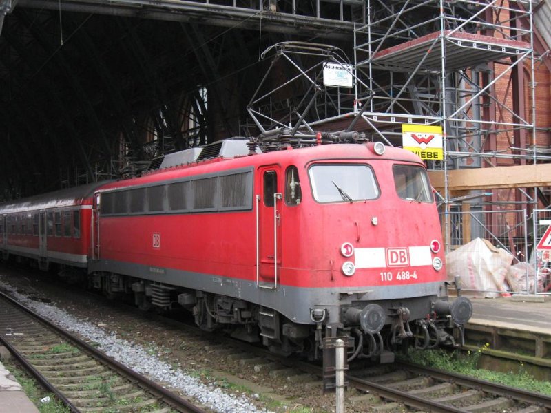 110 488 mit plattgedrückter Bügelfalte ist am 03.11.2008 in Bremen Hbf angekommen. Sie sieht auf Grund ihrer pltten Front etwas merkwürdig aus. Auch sie hat die neue Nummer schon auf den Seiten erhalten.