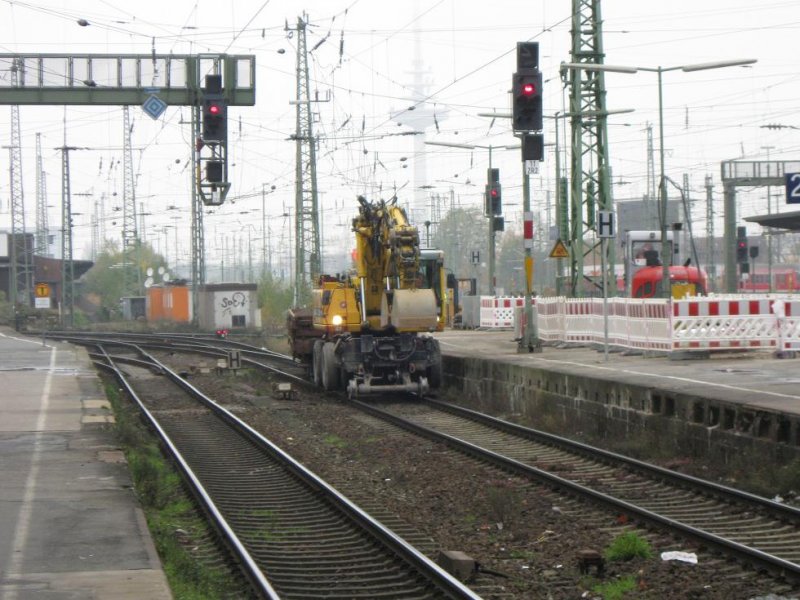 Gleisbagger mit vierachsigem Niederbordwagen durchfährt den Bremer Hauptbahnhof. Foto: 03.11.2008