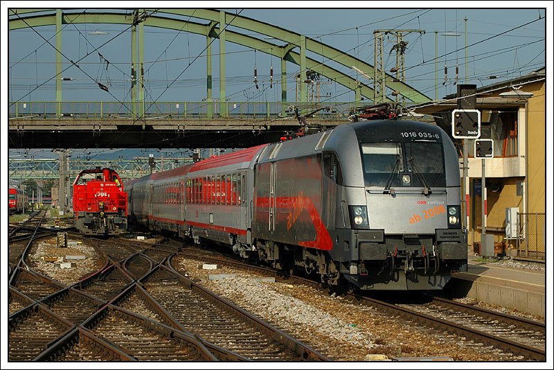 OEC 668  Fachhochschule Vorarlberg  von Graz nach Bregenz, war am 27.7.07 mit dem RailJet Vordesingtaurus 1016 035 bespannt. Die Aufnahme entstand kurz nach Braz bei der Talfahrt der Arlberg Westrampe.