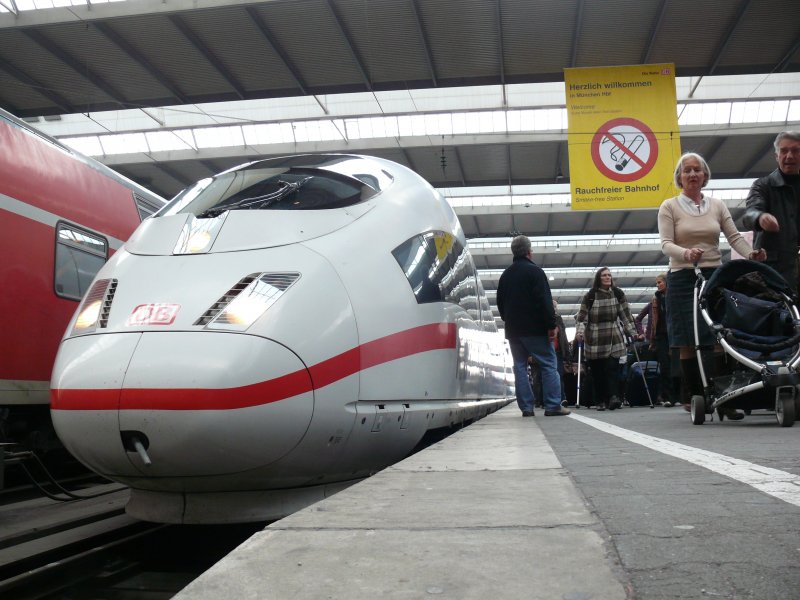 Dichtes Treiben herrscht neben den eben eingefahrenen ICE 3 in München Hbf, 5.4.2009
