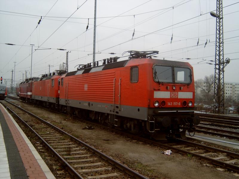 Drei Lokomotiven vom Typ 143 stehen zusammen gekoppelt auf dem Dresdner Hauptbahnhof