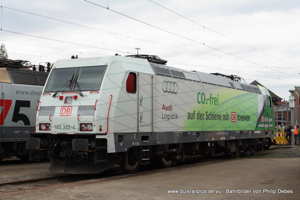 185 389-4 (CO2-frei auf der Schiene mit DB Schenker) steht am 19. September 2010 im Betriebswerk Osnabrück (Doppeljubiläum: 125 Jahre Betriebswerk Osnabrück und 175 Jahre Eisenbahn in Deutschland)