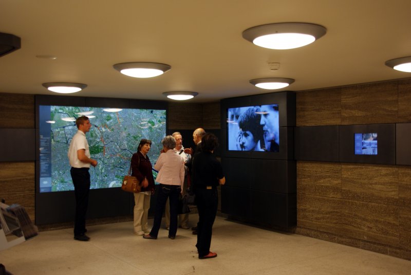 Geschichtunterricht  auf dem Monitor im Vorraum des Bahnhofs  Brandenburger Tor .