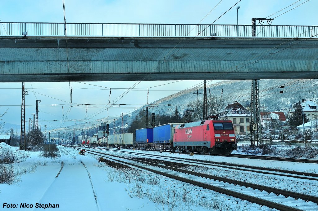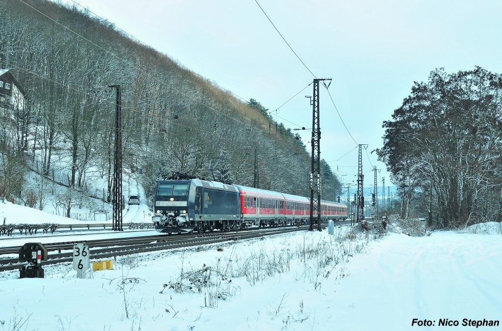 Einer der Gründe für den Urlaub,185 557-6 mit RE 4616 Würzburg Hbf - Frankfurt(Main)Hbf,auf der Fahrt in die Bankenmetropole,Gemünden/Main (Fotourlaub Gemünden 31.01.10)