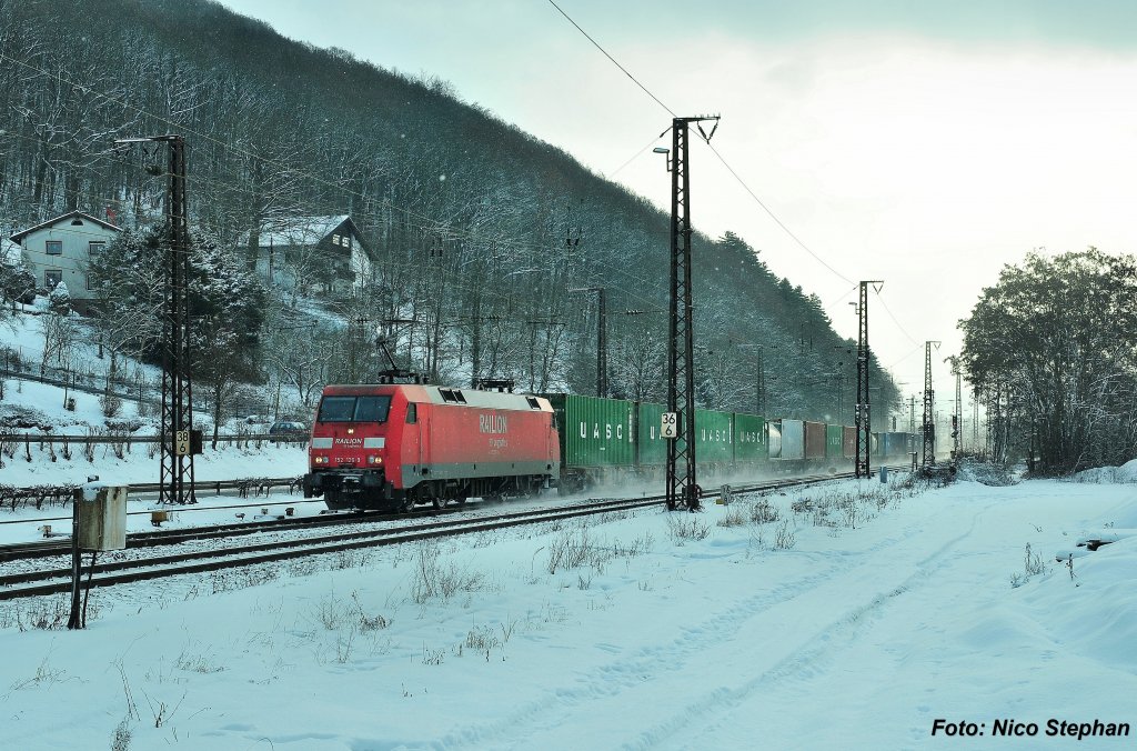 Erster fotografierter Zug des Tages,was Schwarzes! 185 554-3,die Einzige mit einem etwas größeren Latz versehene Lok hier,war mit RE 4602 Würzburg Hbf - Frankfurt(Main)Hbf unterwegs und wirbelt sichtlich viel Schnee auf,Gemünden/Main (Fotourlaub Gemünden 01.02.10)