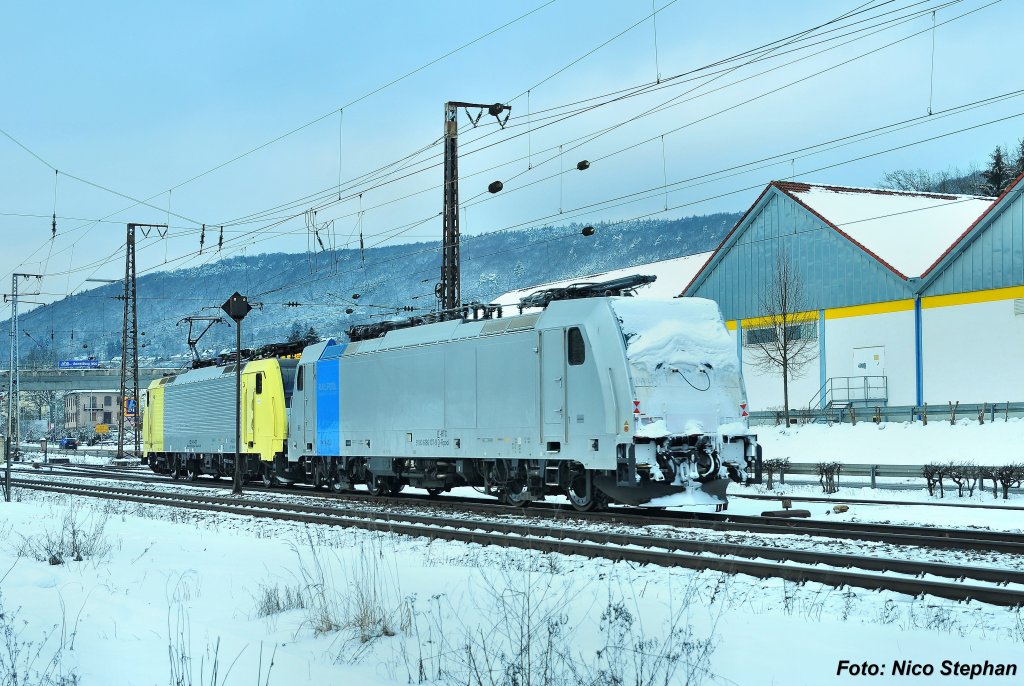 Da lacht der Fotograf! Eine Crossrail-Parade,bestehend aus der weißen 185 580-8  Jana  und der pinken 185 597-2,welche den Zug später übernehmen wird,Gemünden/Main (Fotourlaub Gemünden 01.02.10)