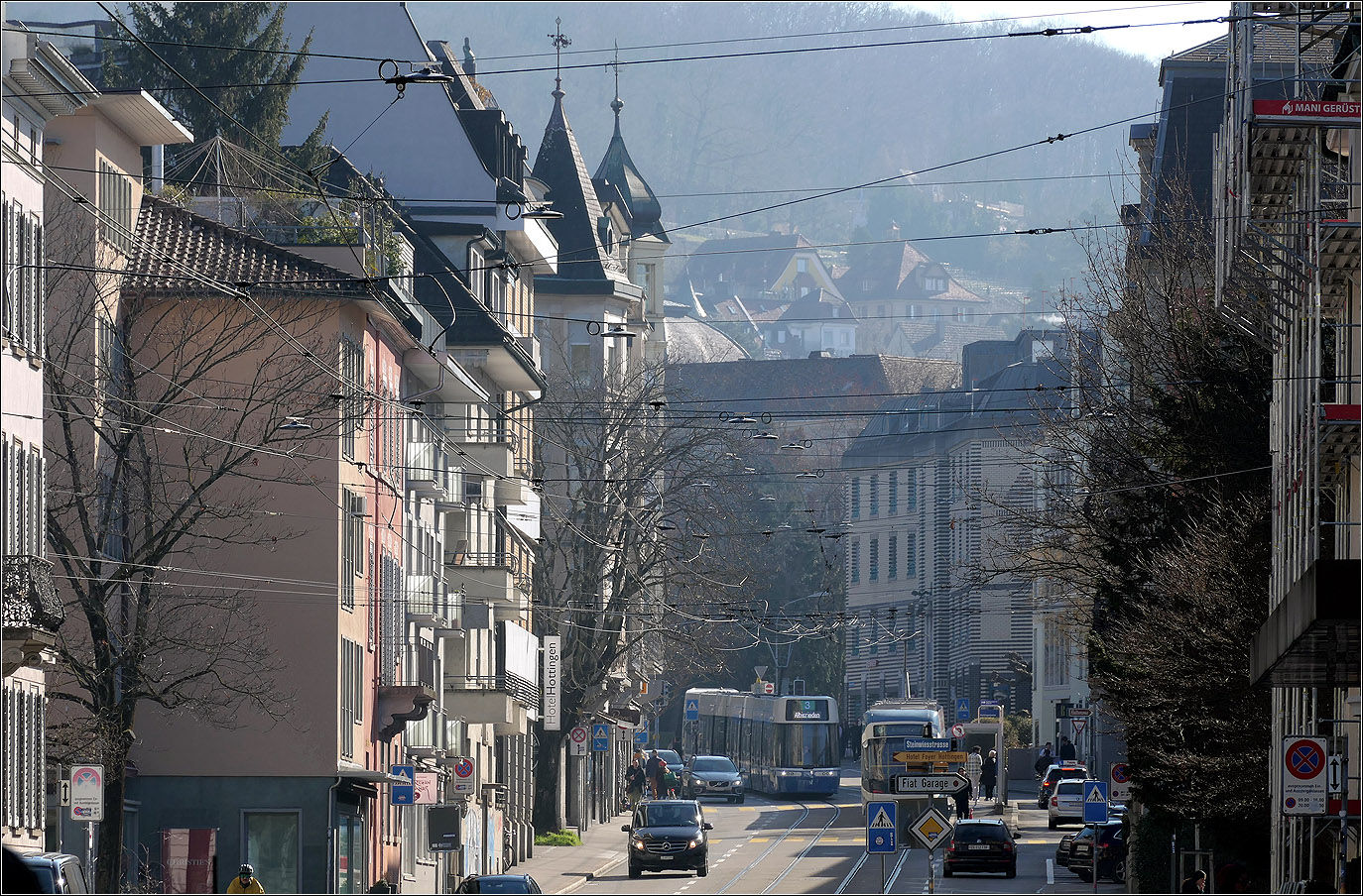 ... geht der Blick in Flucht der Hottingerstraße mit der Begegnung zweier Straßenbahnen der Linie 3 bei der Haltestelle Hottingerplatz. Zürich wirkt hier eher wie eine kleiner Stadt.