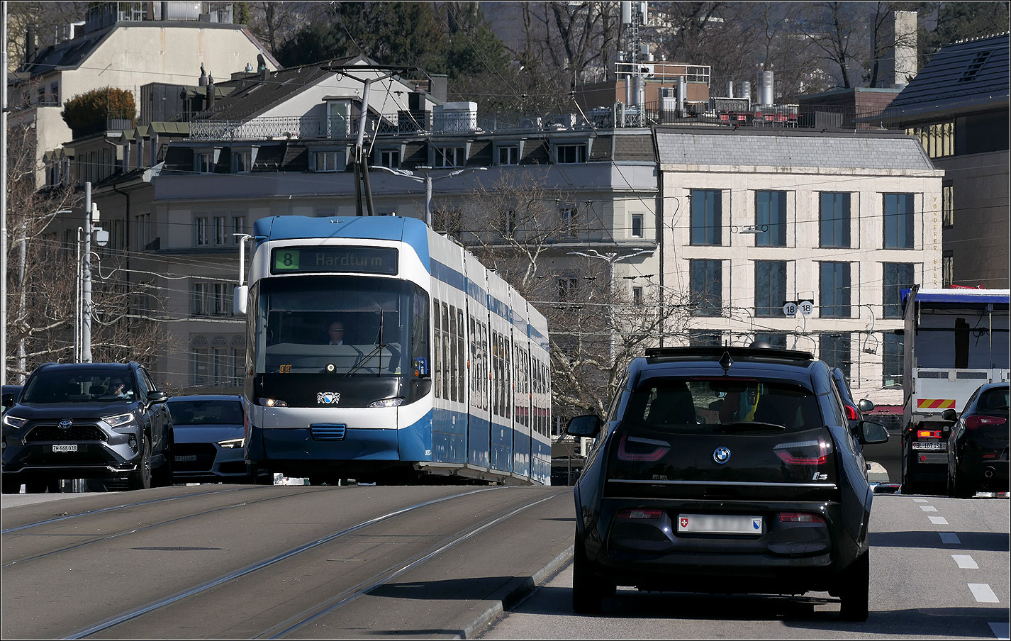 Cobra 3083 - ... der Linie 8 zum Hardturm fährt ungestört vom Auotverkehr über die Quaibrücke. 06.03.2025 (M)