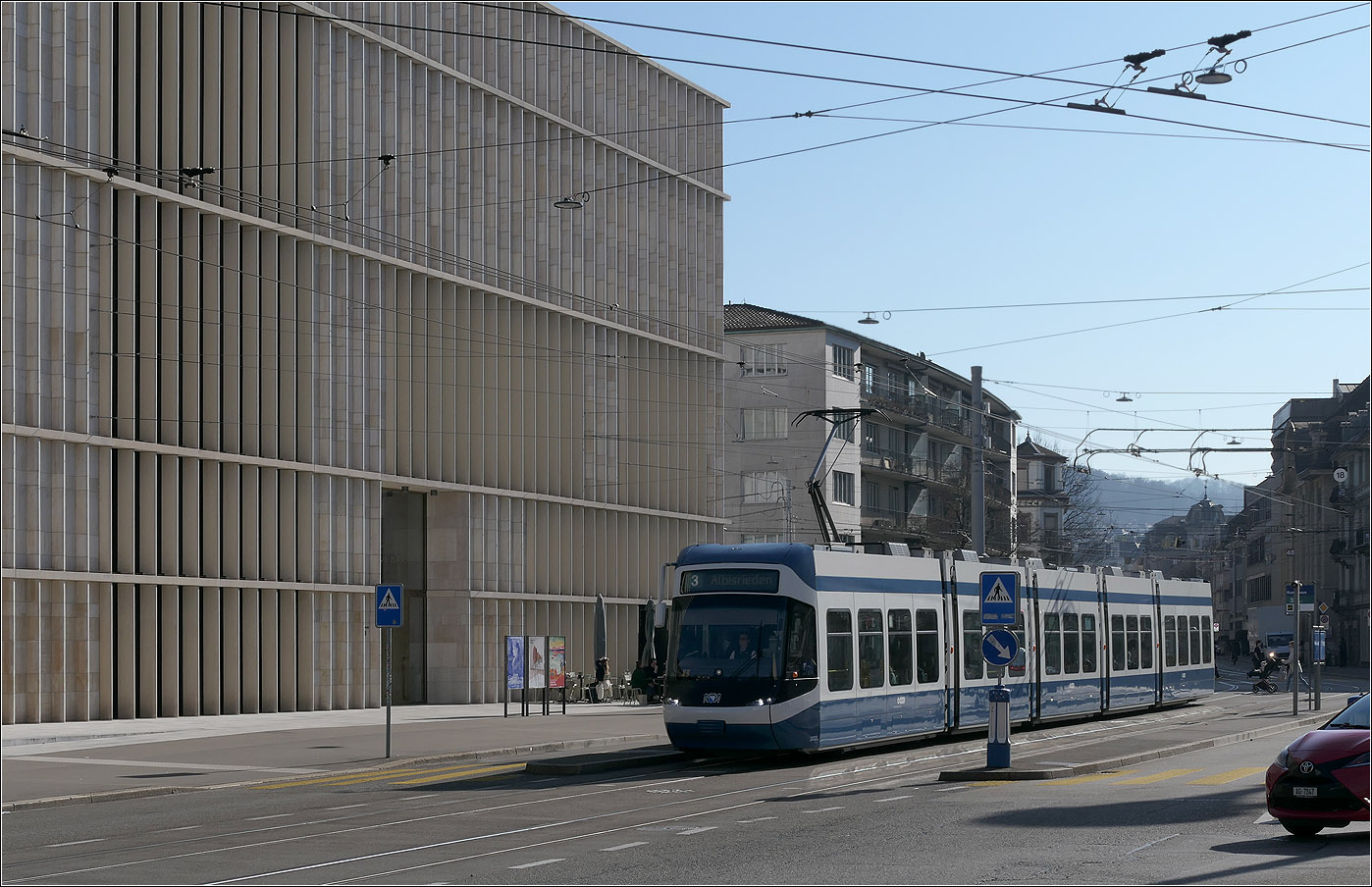 Die Tram am Kunsthaus Zürich - Cobra 3033 der Linie 3 nach Abisrieden an der Haltestelle Kunsthaus. Wie eine Schatzkiste wirkt der Erweiterungsbau des Kunsthauses von David Chipperfield Architects. Der Altbau liegt auf der anderen Seite des Platzes und ist mit dem Neubau unterirdisch verbunden. 06.03.2025 (M)