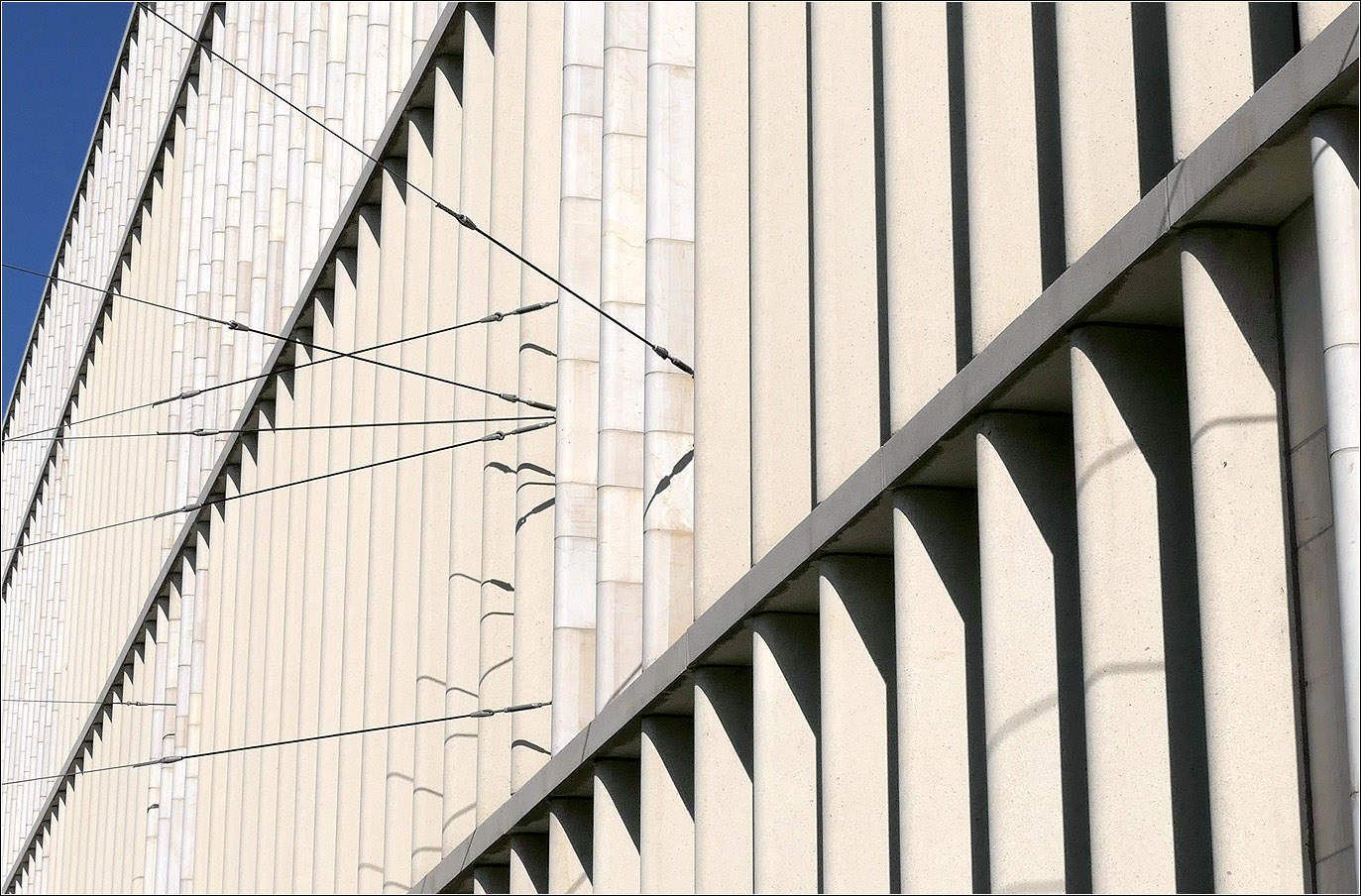 Fahrleitungsanlagen und ihre Schatten an der Fassade der Erweiterung des Kunsthauses.