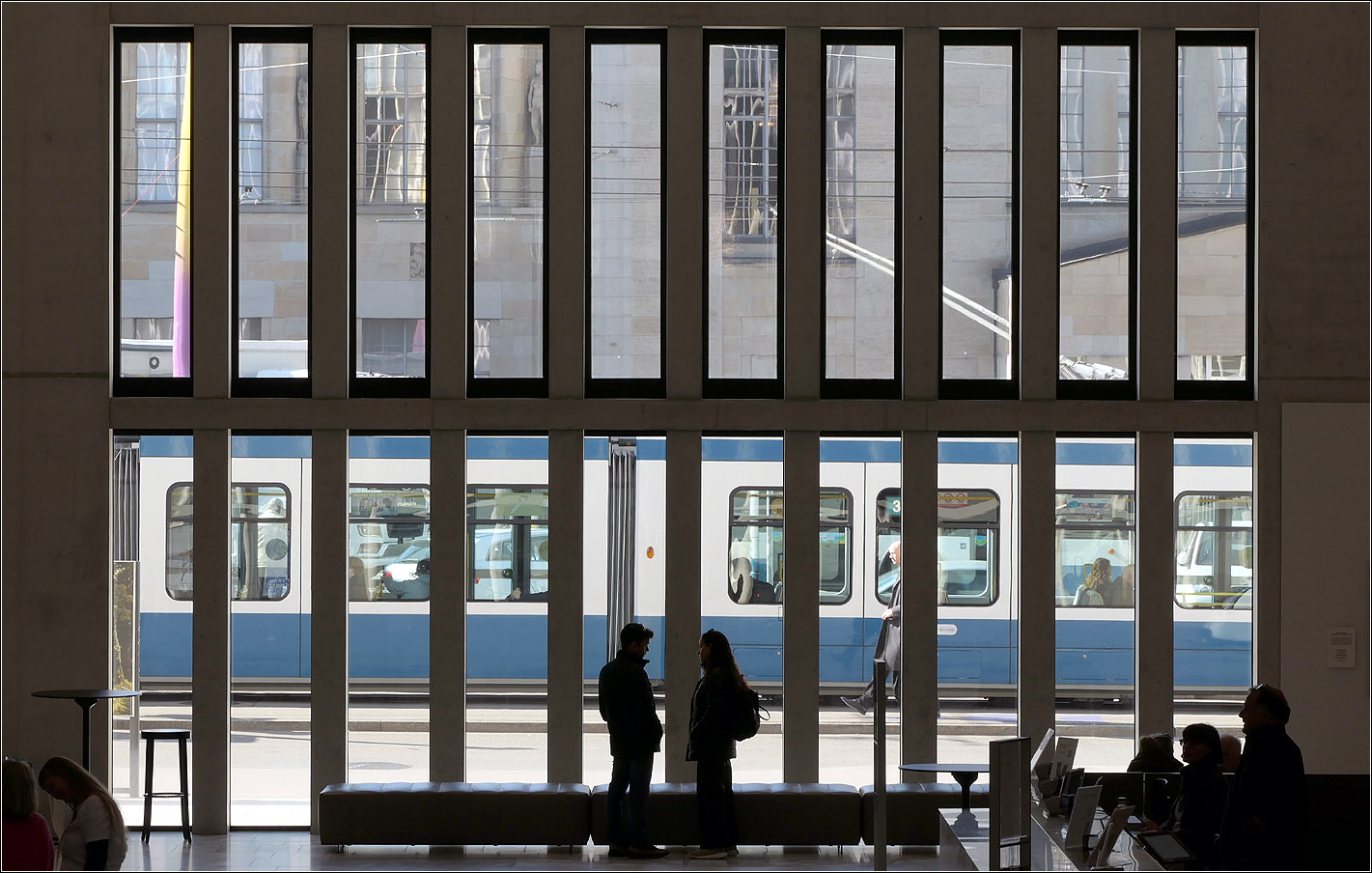 Ausblick von der Halle des Erweiterungsbaues des Kunsthauses Zürich hinaus zur Straßenbahnhaltestelle mit einer Cobra-Tram.