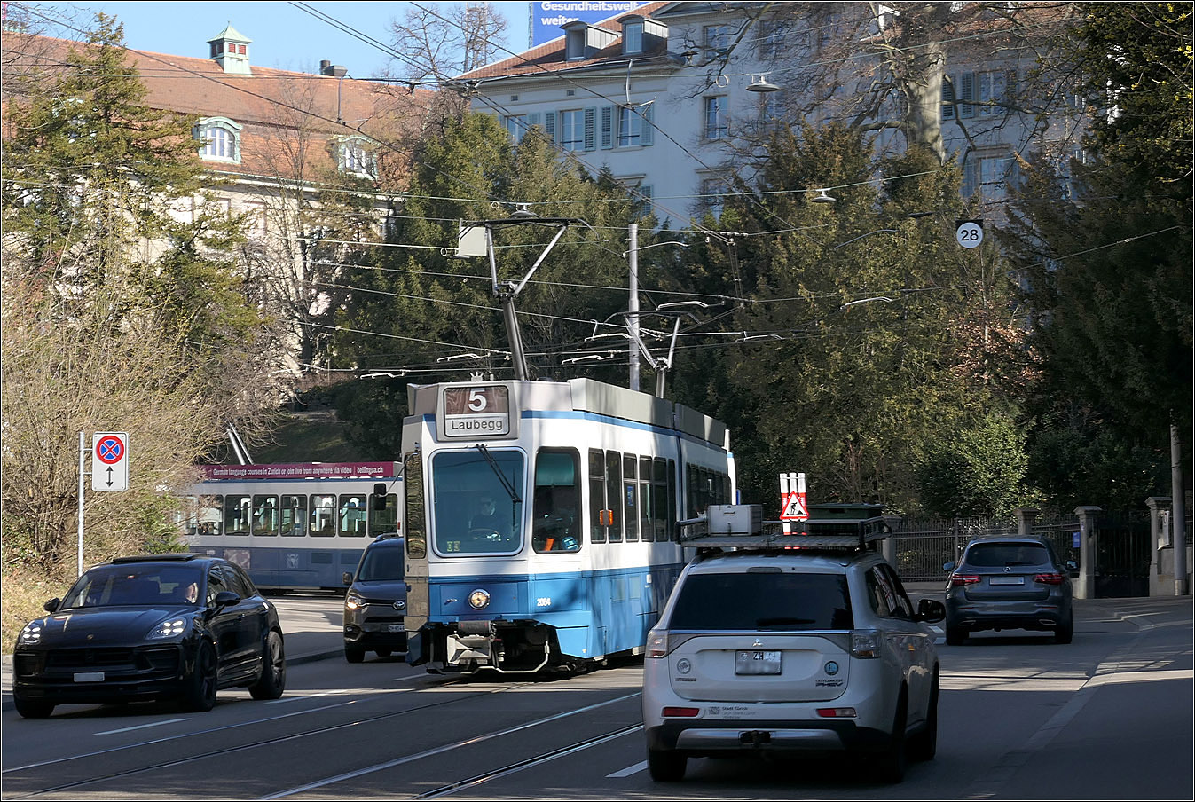 Zwischen den Autos - ... kommt hier Tram 2000 Wagen 2084 der Linie 5 nach Laubegg die Rämistraße herunter, während im Hintergrund eine bergwärts fahrende Bahn um die Ecke verschwindet. 06.03.2025 (M)