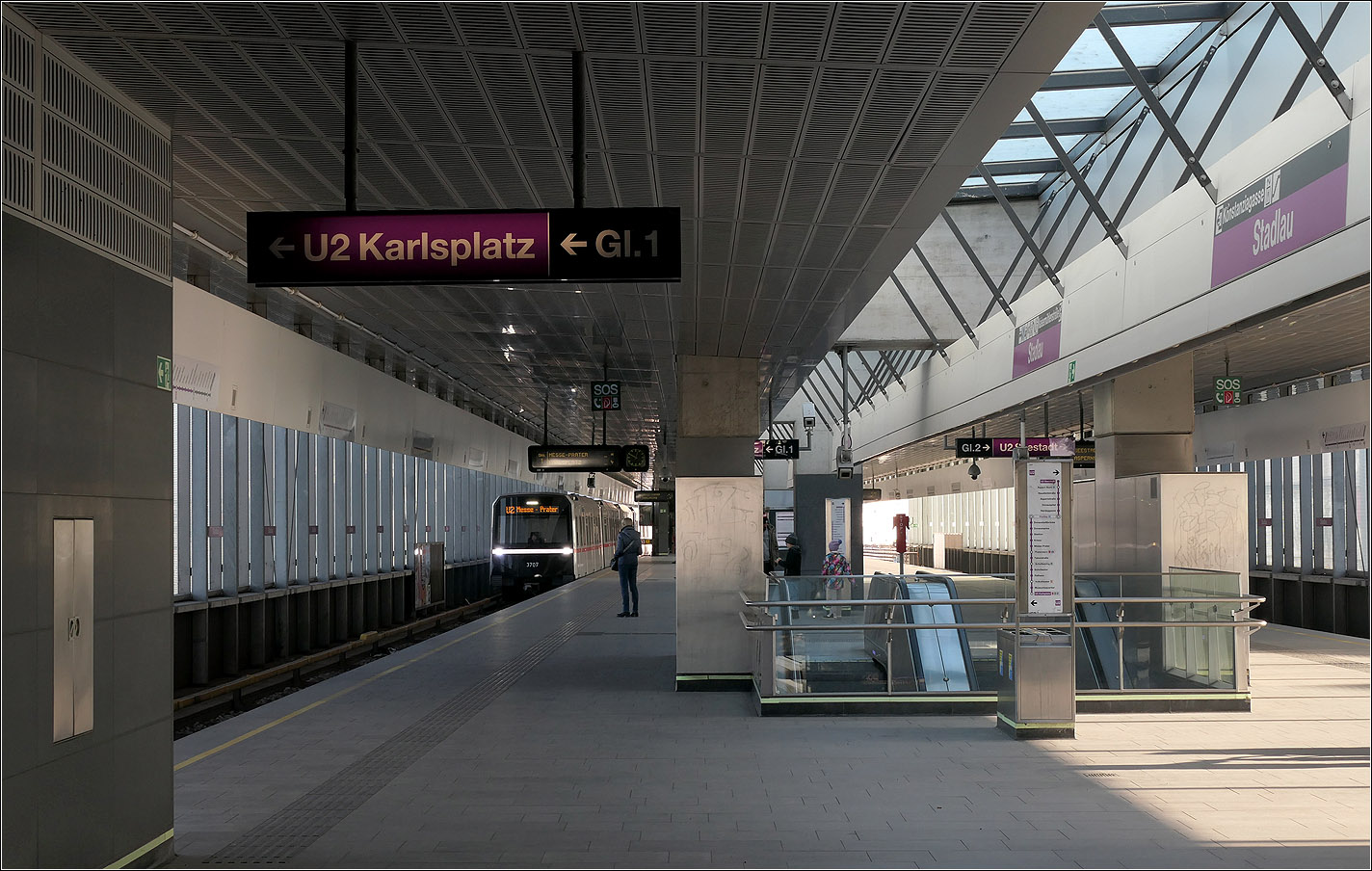 Auf Bahnfoto-Tour durch Wien - eine Chronologie (Di. 04. Feb. 10:04) Der Bahnsteig der U2-Station Stadlau mit einem einfahrende X-Zug. Typisch für die neueren Hochbahn- oder ebenerdigen Stationen der U-Bahn sind die Oberlichtbänder in der Längsrichtung der Bahnsteige. Nach dem Besuch des Umsteigeknotens habe ich meine Fahrt auf der U2 bis Donaustadtbrücke fortgesetzt. 04.02.2025 (M)