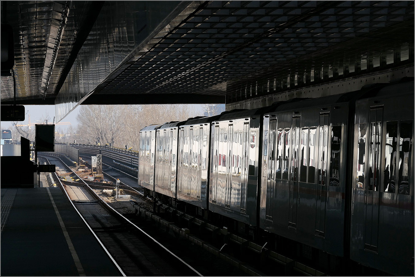 Auf Bahnfoto-Tour durch Wien - eine Chronologie (Di. 04. Feb. 10:12) Lichtreflexionen auf einen an der Haltestelle Donaustadtbrücke abfahrenden V-Zug. 04.02.2025 (M)