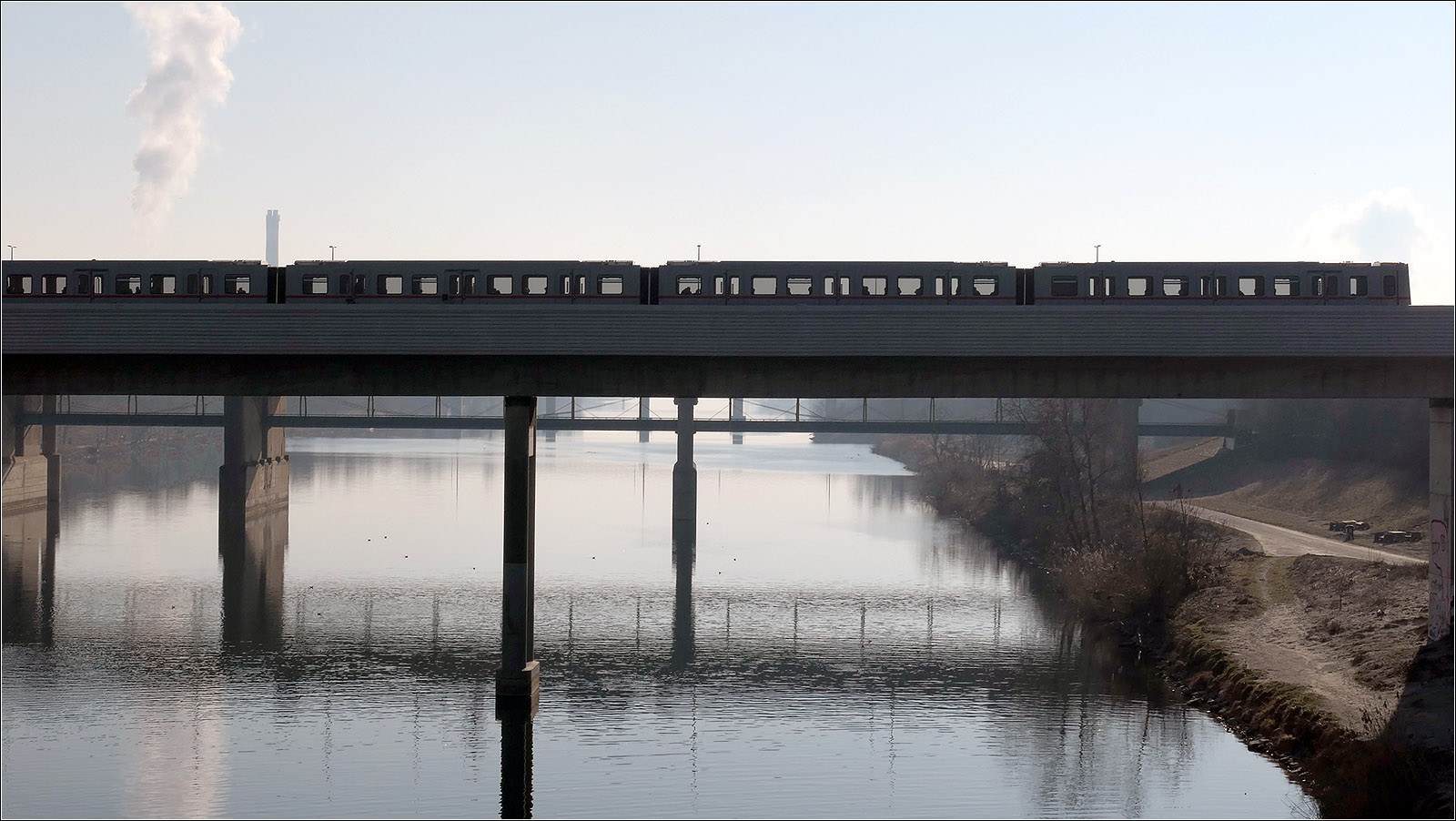 Zu Fuß habe ich mich auf den Weg gemacht um die Donau hier zu queren. Ein X-Zug befährt hier im Gegenlicht den Brückenteil über die Neu Donau der Donaustadtbrücke.