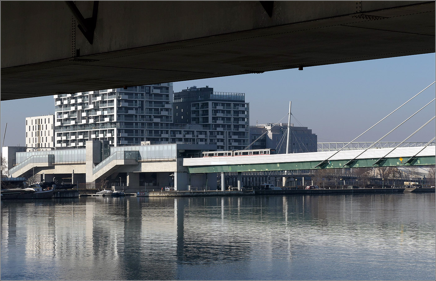 Auf Bahnfoto-Tour durch Wien - eine Chronologie (Di. 04. Feb. 10:28) Während man die Neue Donau zu Fuß über das Wehr 1 nordwestlich der U2-Donaustadtbrücke überqueren kann, führt über die eigentliche Donau ein Fußgängerweg unter der südöstlichen Autobahnfahrbahn der Praterbrücke, die auf der Südostseite der Donaustadtbrücke liegt. Vom dortigen Aufgang hat man unter der Praterbrücke hindurch diesen Blick auf die U2-Station Donaumarina und auch die Donaustadtbrücke. 04.02.2025 (M)