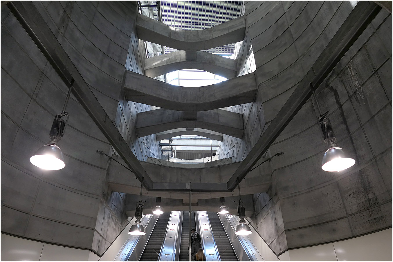 Blick aus der Tiefe des U2-Bahnhofes Schottenring nach oben in Richtung Ausgang und Bahnhofsteil der Linie U4, die hier in einfacher Tieflage verkehrt.
