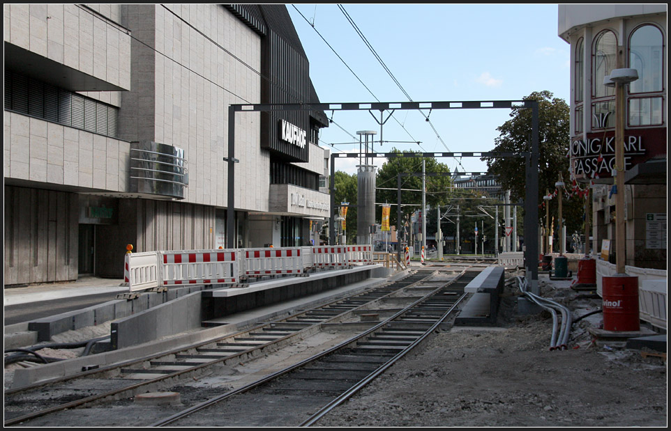 Abgesenkt - Um den Bau der hohen Bahnsteige an der Haltestelle Bad Cannstatt Wilhelmsplatz der Linie U13 gab es lange kontroverse Diskussionen. Die CDU- und FDP-Fraktionen hätten diesen Abschnitt lieber stillgelegt (mehr Parkplätze) und die U13 dauerhaft über die König-Karl-Brücke und Wilhelma umgeleitet. Dafür hätte die U13 eine zusätzlichen Kurs benötigt. Die aktuellen Mehrheitsverhältnisse haben dann doch zum Ausbau der bestehenden Haltestelle geführt. Die Gleise wurden hier etwas abgesenkt um die Bahnsteig nicht allzu hoch aufragen zu lassen. 19.09.2010 (M)