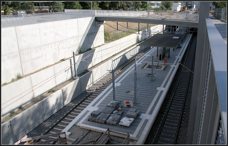 Übermorgen am Dienstag den 22.09.2010 werden das erste Mal Stadtbahnen diese neue Strecke durch das Wohn- und Gewerbegebiet Fasanenhof für Test-, Prüf- und Messfahrten befahren. In Betrieb geht die Strecke am 11. Dezember. Im Hintergrund die Haltestelle Bonhoefferkirche am Beginn der Tunnelstrecke. 19.09.2010 (M)