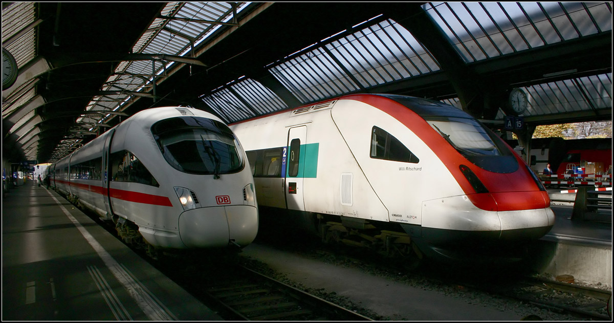 ICE-T und ICN im Züricher Hauptbahnhof. Dieser ICE-T musste im Züricher S-Bahntunnel signalbedingt kurz vor der Station Stadelhofen anhalten. Da der Tunnel hier ansteigt, war es ihm dann nicht möglich wieder anzufahren. Es kam dann die Durchsage, unser Zug müsse ein Stück zurückfahren, um Anlauf zu holen...