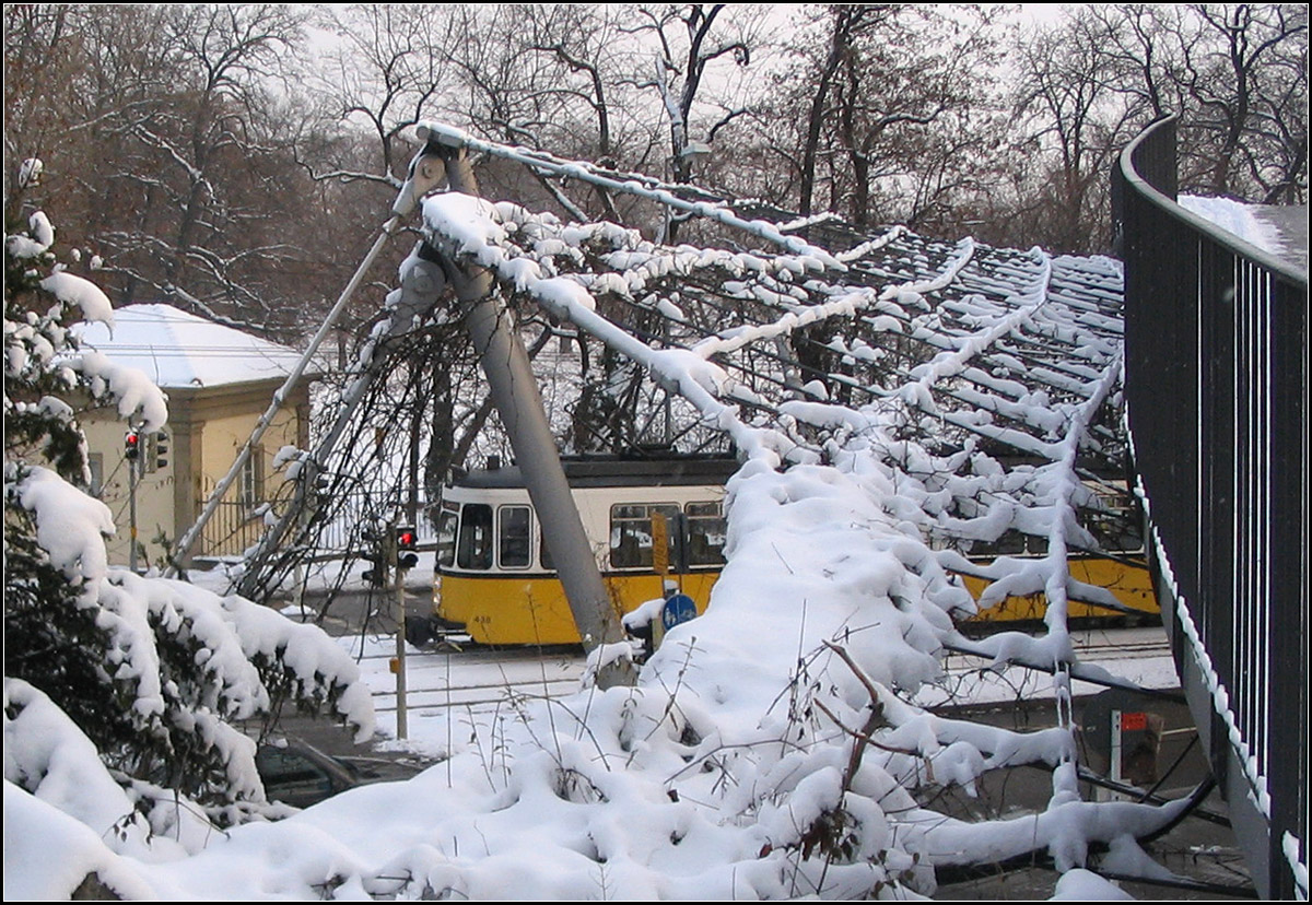 Unterm eingeschneiten Seilnetz - Eine Straßenbahn der Stuttgarter Linie 15 am Löwentor. 29.12.2005 (J)
