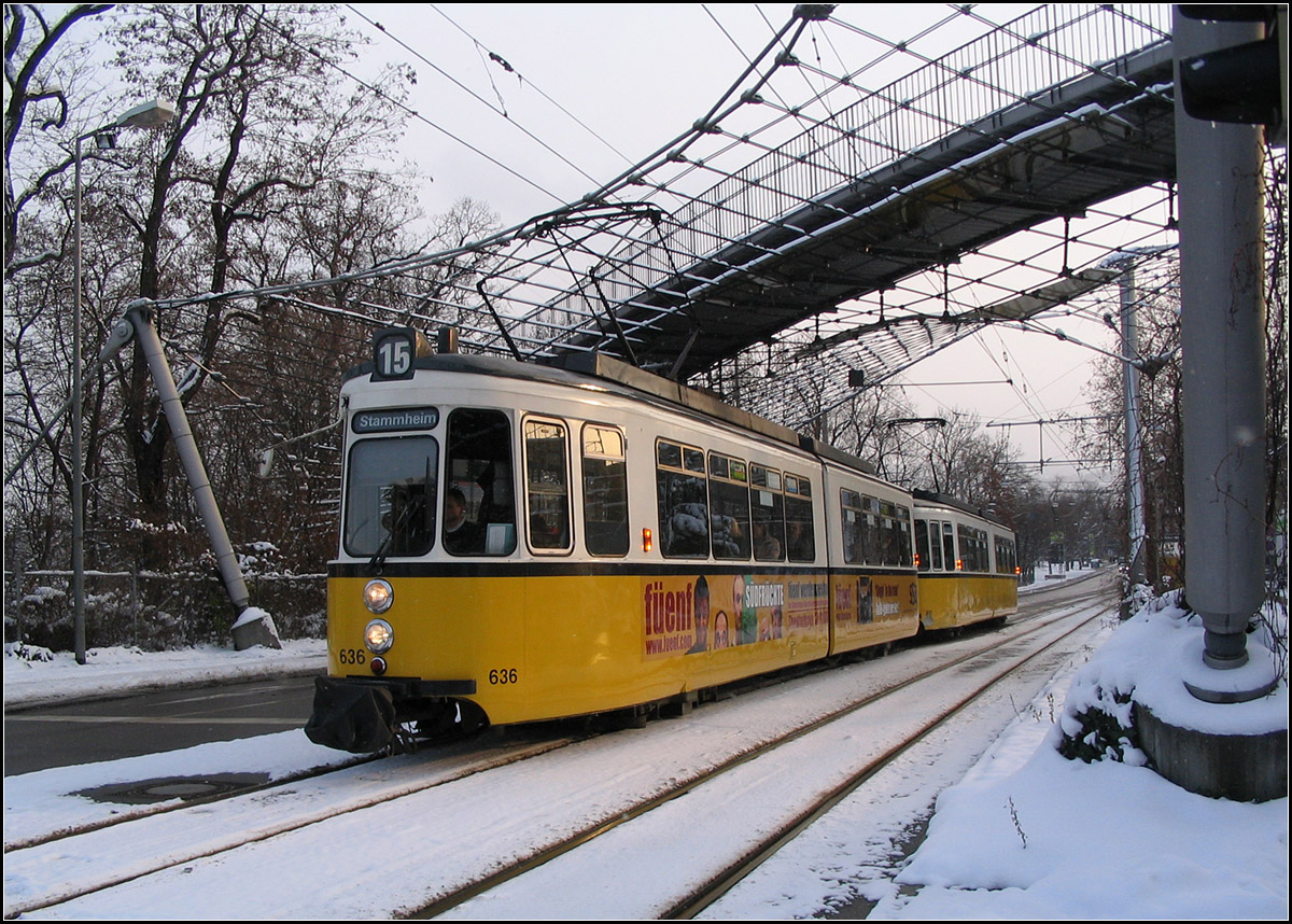 Winter in Stuttgart - Eine Straßenbahn der Linie 15 am Löwentor. 29.12.2005 (J)
