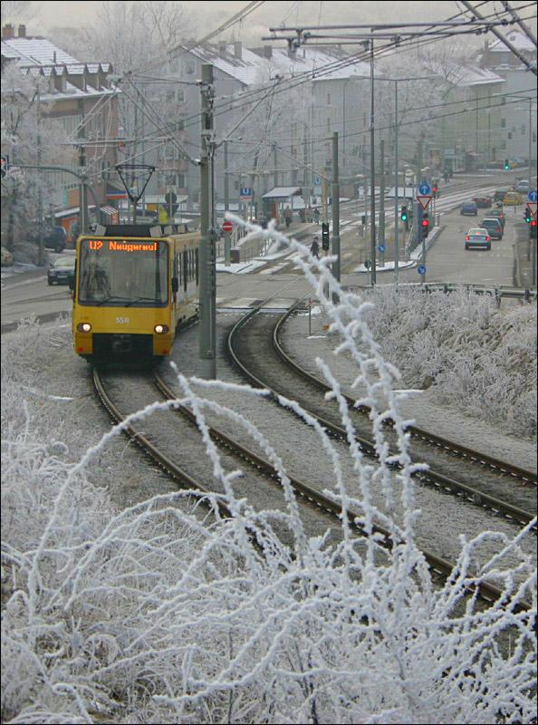. Bei Raureif den Berg hinauf - Am Beginn der Steigungstrecke der U2 zum Hauptfriedhof. Diese Streckenstück wurde 2002 mit Umstellung des 2ers auf Stadtbahnbetieb neu eröffnet. Im Hintergrund ist die Haltestelle Obere Ziegelei zu erkennen. 03.01.2006 (Ma)