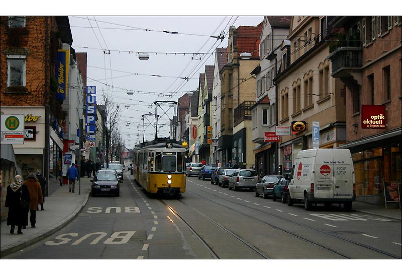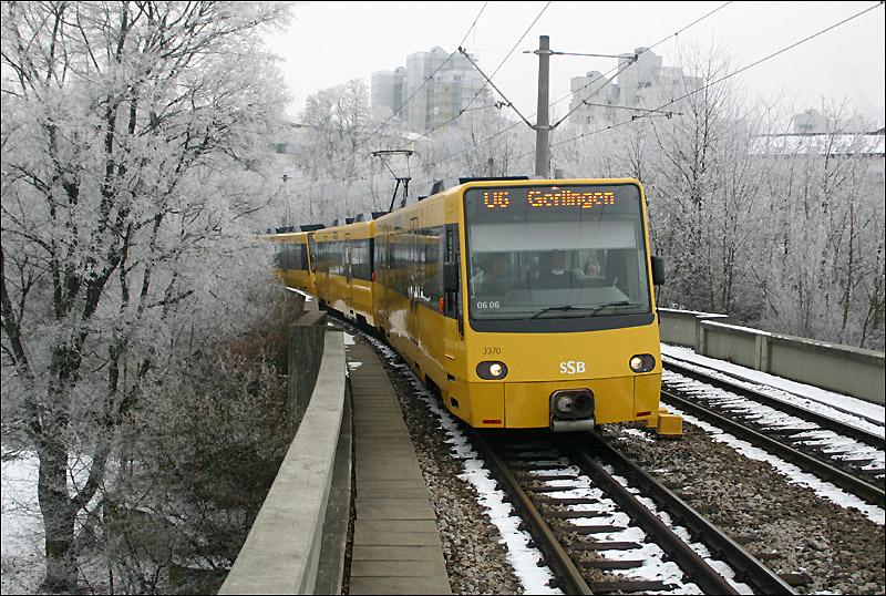 Die Straßenbahn über ihrer Stadt - GT4-Triebwagen der Stuttgarter Linie 15 auf der Pischekstraße. 13.01.2006 (M)