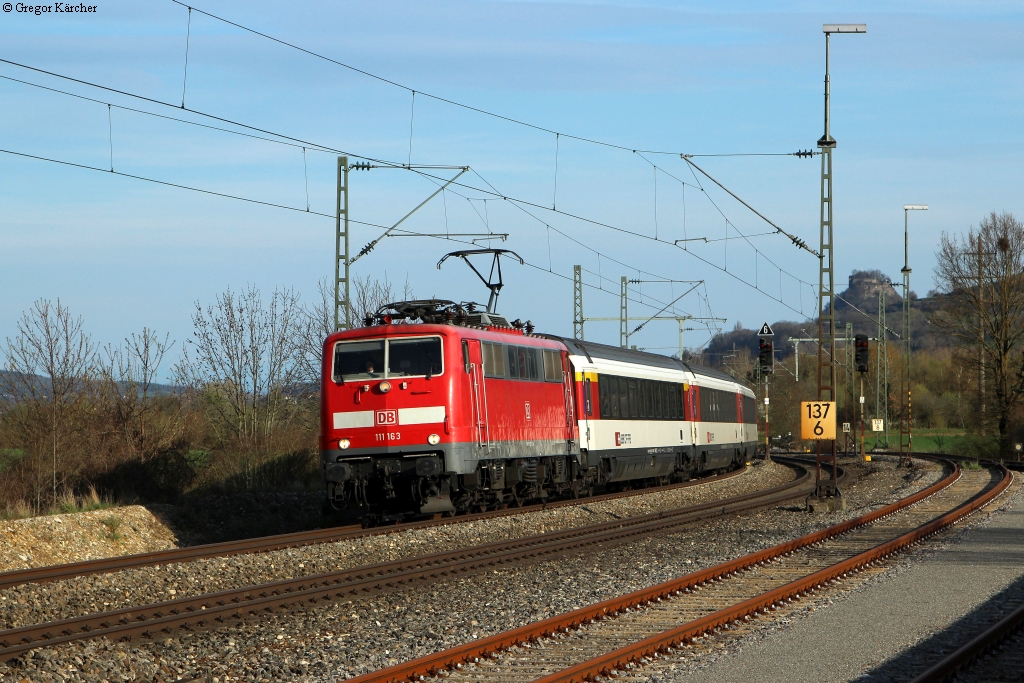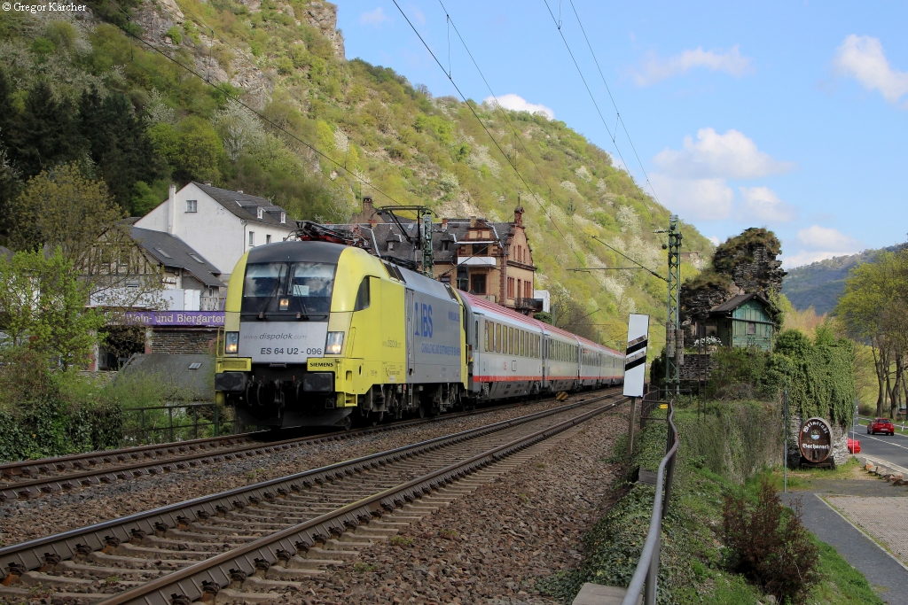 Auf dem Rückweg zum Bahnhof Bacharach tauchte im Hintergrund ein ICE-Umleiter auf. Also schnell die Böschung hochgegangen und so entstand bei einer Unterführung diese Feldmausperspektive. Das Bild entstand legal, ich stand vor der Absperrung. 403 011 "Wiesbaden" am 18.04.2015. Gregor Kaercher
