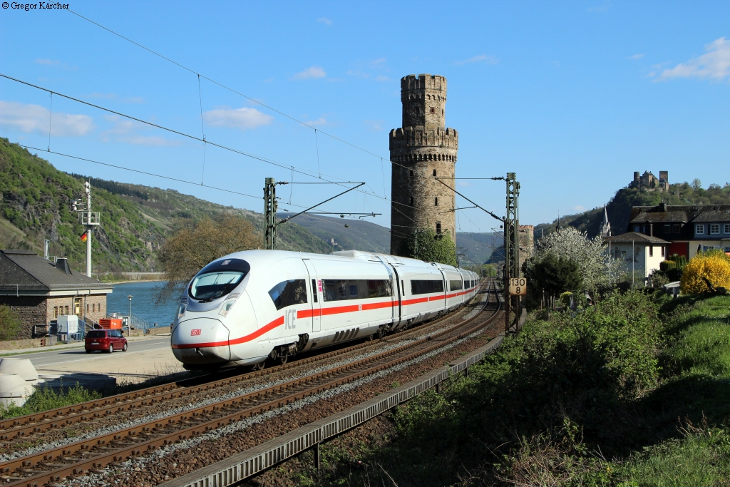 403 *** unterwegs auf der rechten Rheinstrecke Richtung Köln. Wegen Vollsperrung der SFS wurde der Zug umgeleitet. Oberwesel, 18.04.2015. Gregor Kaercher