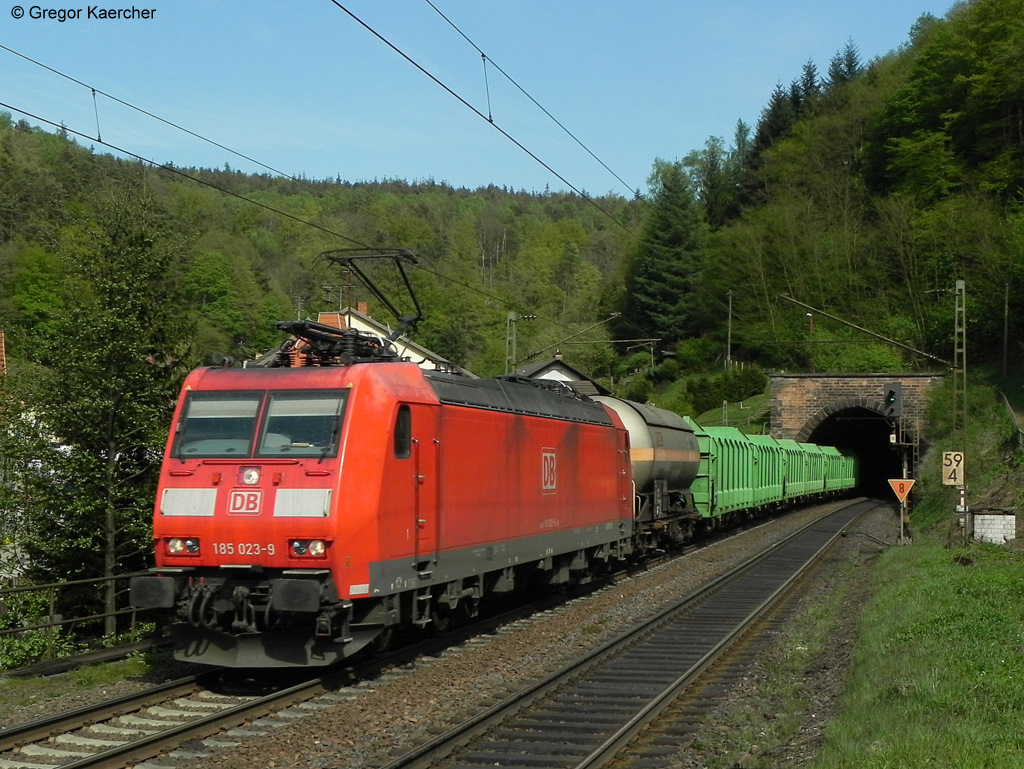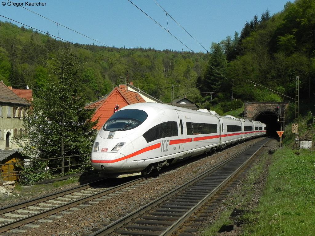Mit ca. +20 verkehrte 406 084  Schwäbisch Hall  am 23.04.2011 als ICE 95** von Frankfurt (Main) nach Paris. Hier taucht er gerade aus dem 208 Meter langen Schloßbergtunnel in Frankenstein (Pfalz)auf.