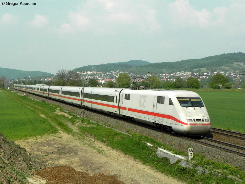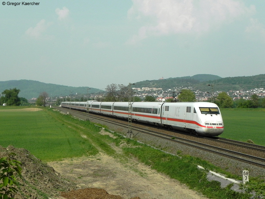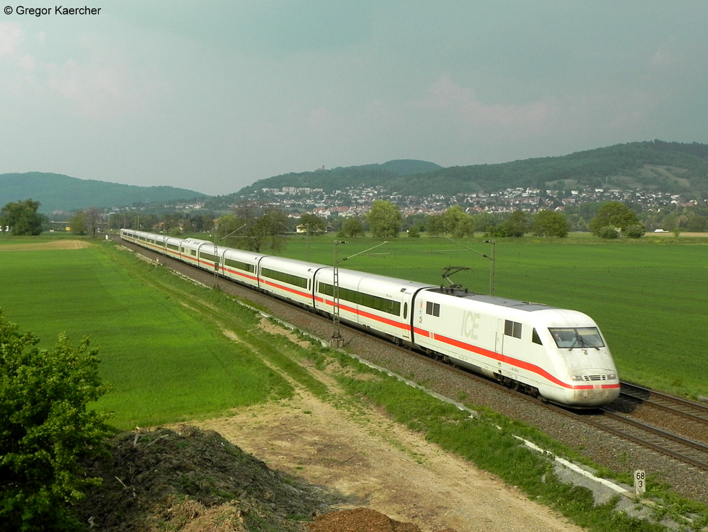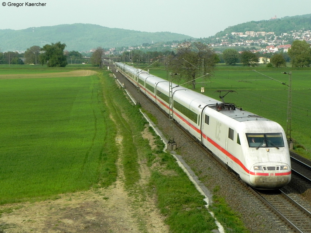 401 014-6  Friedrichshafen  als ICE 574 (Stuttgart - Hamburg-Altona) bei Heddesheim-Hirschberg (ehemals Großsachsen-Heddesheim). Aufgenommen am 24.04.2011. An diesem Tag fuhren die ICE-Züge wegen Bauarbeiten in Frankfurt-Stadion über die Main-Neckar Bahn.