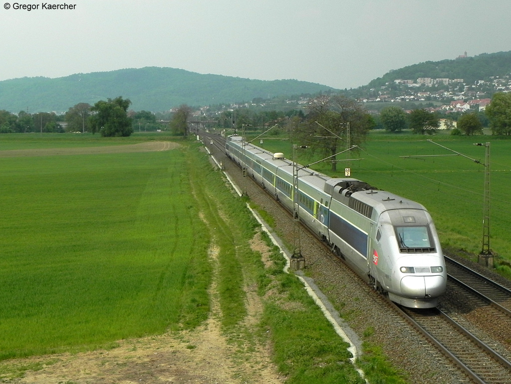 Der TGV POS 4419 als TGV 9552 unterwegs auf seiner ersten Etappe von Frankfurt (Main) Hbf bis nach Paris Est. Aufgenommen am 24.04.2011 bei Heddesheim-Hirschberg (ehemals Großsachsen-Heddesheim). Der Zug wurde wegen Bauarbeiten in Frankfurt-Stadion über die Main-Neckar Bahn umgeleitet.