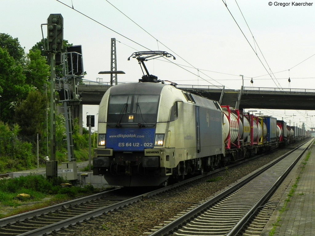 Die ES 64 U2 - 022 fährt mit einem Containerzug im Bahnhof Heddesheim-Hirschberg (ehemals Großsachsen-Heddesheim) Richtung Norden durch. Man beachte mal neben der Lok das Ausfahrsignal. Das neue KS-Signal für das ESTW Weinheim ist hier bereits aufgestellt.