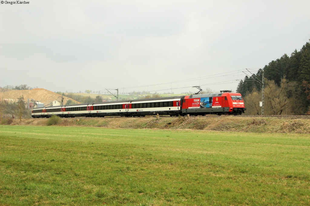 115 198-4 mit dem IC 183 Stuttgart-Zürich mit etwa 40 Minuten Verspätung bei Oberndorf-Aistaig. Wegen der Verspätung, die durch einen defekten Güterzug verursacht wurde, endete der Zug schon in Schaffhausen. Aufgenommen am 05.04.2014. Gregor Kaercher