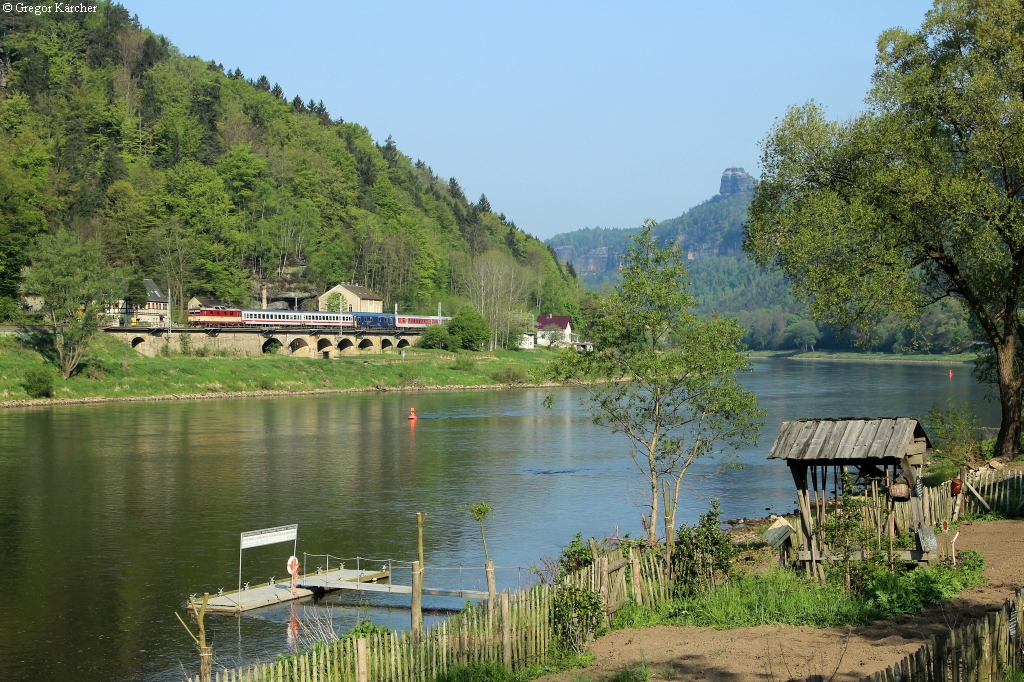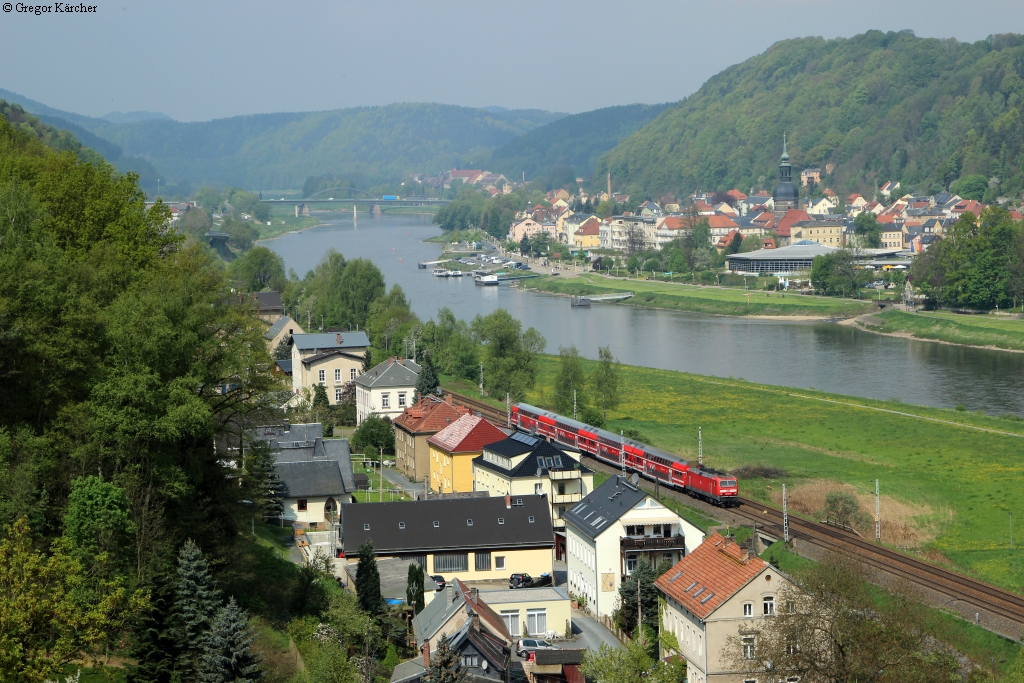 Eine S1 nach Meißen-Triebischtal. Schublok ist der Werbetaurus 182 016. Aufgenommen am 24.04.2014 in Königstein. Daneben hat noch der Raddampfer "Pillnitz" in Königstein angelegt. Gregor Kaercher