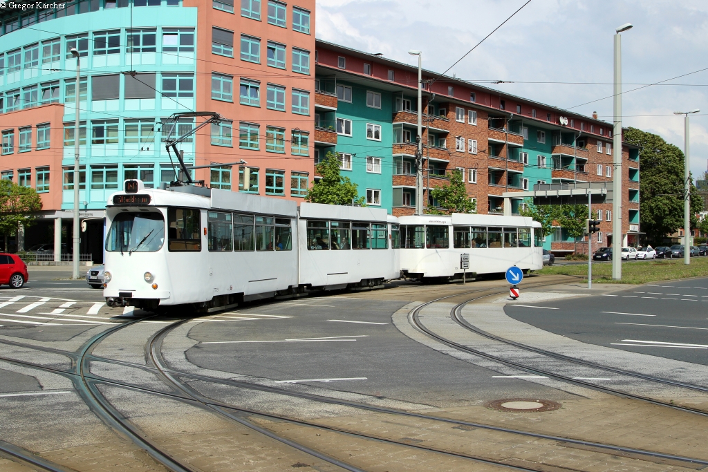 Die HVLE 330.16 mit dem leeren Stahlzug nach Ilsenburg, hier der Zug in seiner vollen Breite bei Goslar mit Blick zum Brocken, 20.04.2014. Gregor Kaercher