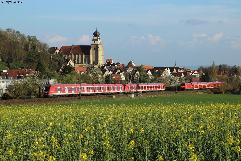 Während zwei Triebwagen der Baureihe 430 als S1 gerade Herrenberg verlassen, fährt rechts die 146 211-8 mit dem RE 19047 Stuttgart-Singen in Herrenberg ein. Aufgenommen am 06.04.2014 Gregor Kaercher