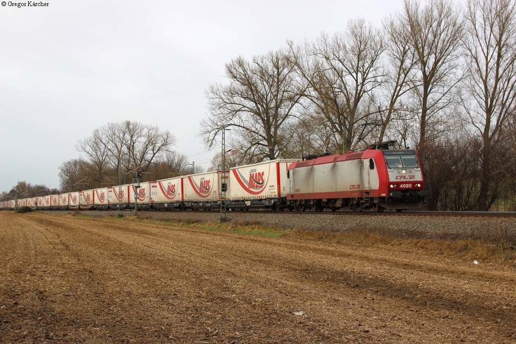 Die CFL 4020 zieht am 15.01.2014 den Mars Logistic KLV (DGS 49511 Bettembourg (LUX)-München Laim Rbf)und konnte dabei bei Diedelsheim fotografiert werden. Gregor Kaercher